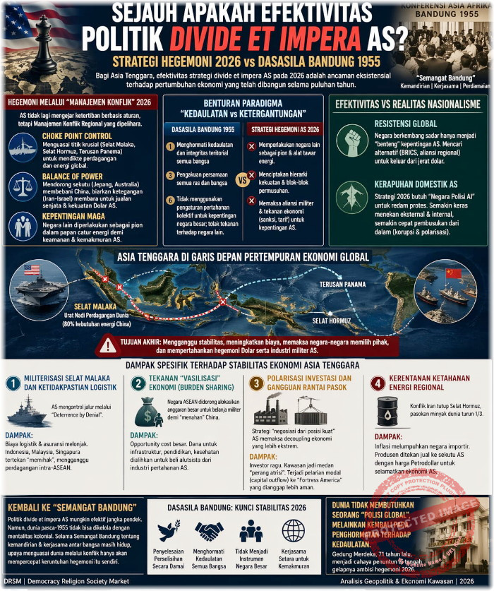 Dalam kajian berjudul _“Sejauh Apakah Efektivitas Politik Divide et Impera AS? Strategi Hegemoni 2026 vs Dasasila Bandung 1955”_, DRSM menyebut taktik pecah belah dan kuasai muncul kembali dalam kemasan teknologi tinggi, bertolak belakang dengan semangat Konferensi Asia Afrika 1955 di Bandung.
