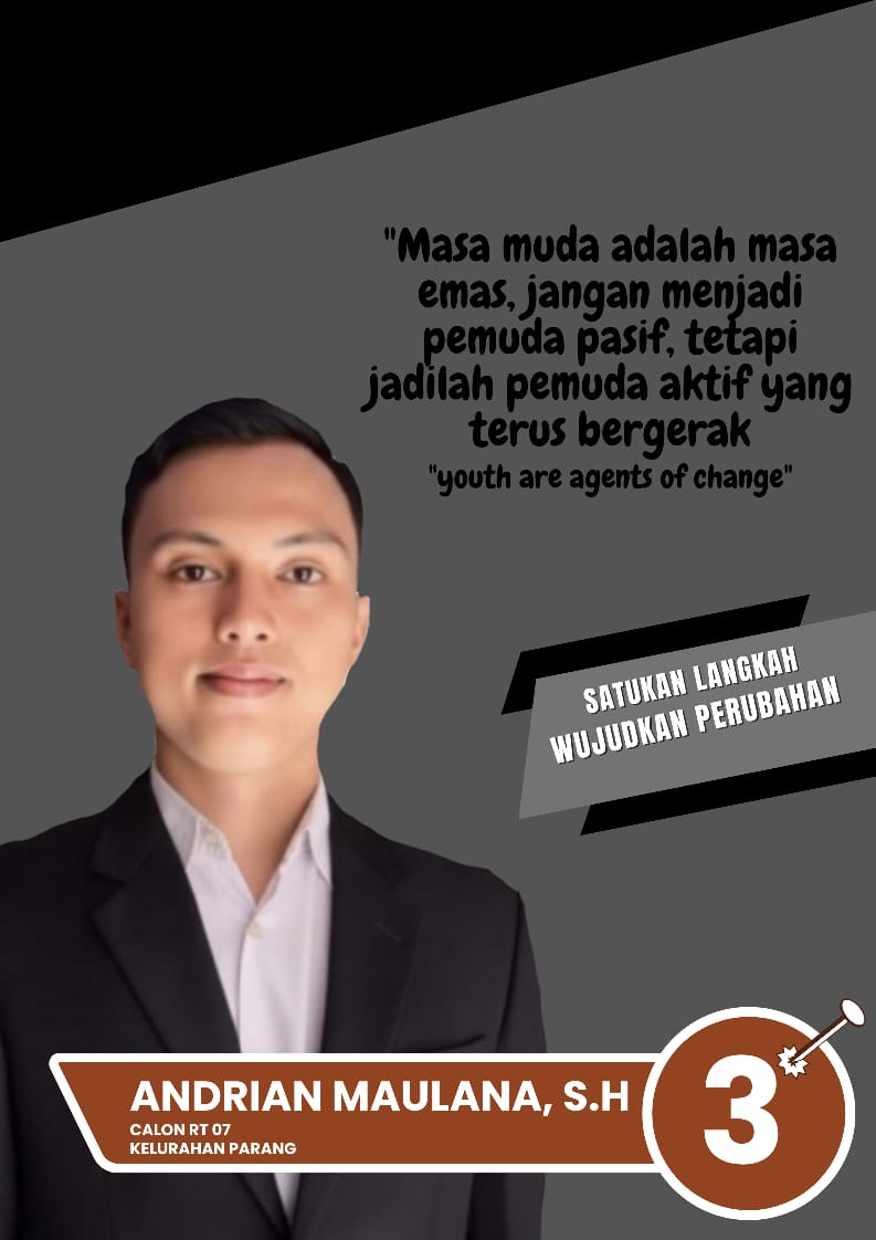 Makassar_HARIANESIA.COM_ Andrian Maulana, S.H., secara resmi menyatakan diri maju sebagai calon Ketua RT 07 Kelurahan Parang dengan mengusung gagasan besar mengenai pentingnya peran generasi muda dalam pembangunan lingkungan. Melalui kampanye yang terstruktur dan bernuansa edukatif, ia menekankan bahwa masa muda merupakan fase strategis yang harus dimanfaatkan untuk berkarya dan berkontribusi nyata bagi masyarakat.