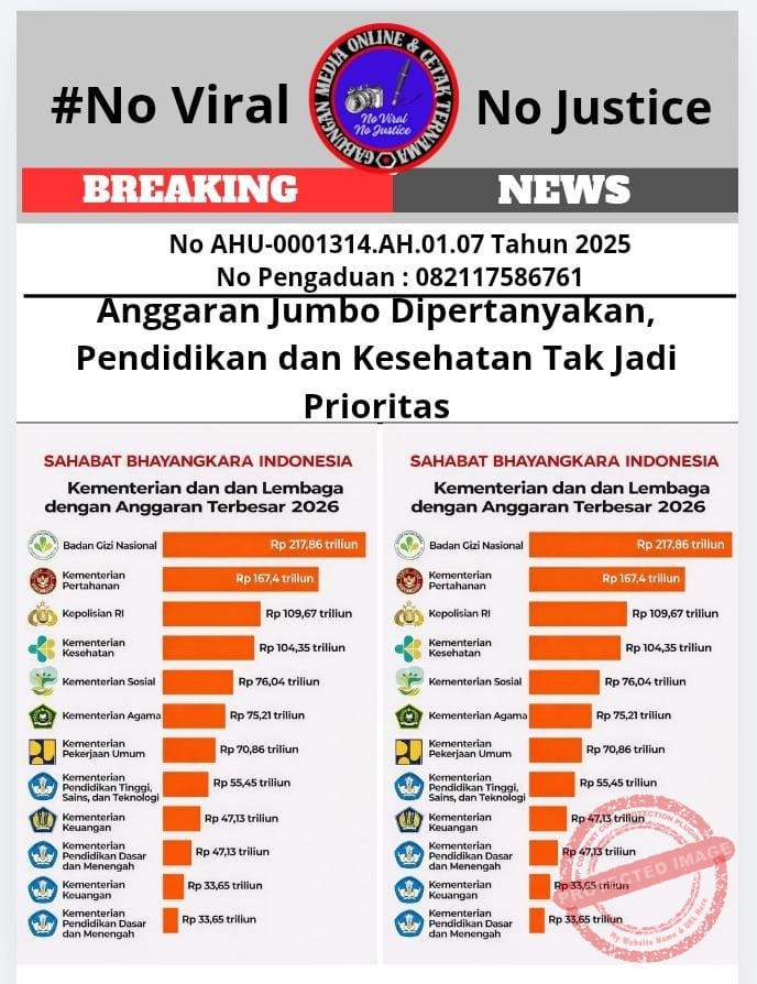 Jakarta -Arah kebijakan penganggaran negara kembali menjadi sorotan. Informasi ini diperoleh oleh Gabungan Media Online Cetak Ternama (GMOCT) dari media online Kabarsbi.com yang tergabung dalam organisasi tersebut. Sosial control sekaligus Pimpinan Redaksi Sahabat Bhayangkara Indonesia (Kabarsbi.com) dan Ketua Umum GMOCT, Agung Sulistio, menilai kebijakan anggaran pemerintah belum sepenuhnya berpihak pada sektor pendidikan dan kesehatan sebagai kebutuhan dasar masyarakat.