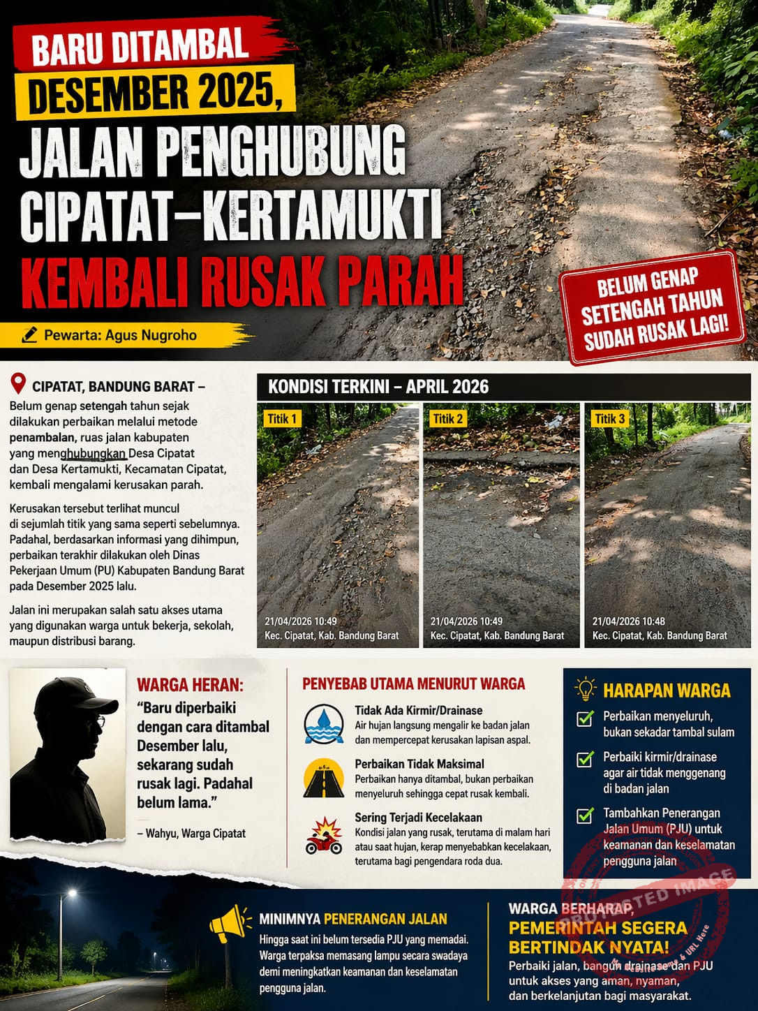 Ia juga mengungkapkan bahwa kondisi jalan yang rusak tersebut telah beberapa kali menyebabkan kecelakaan lalu lintas, terutama bagi pengendara roda dua yang melintas di malam hari atau saat kondisi jalan basah.