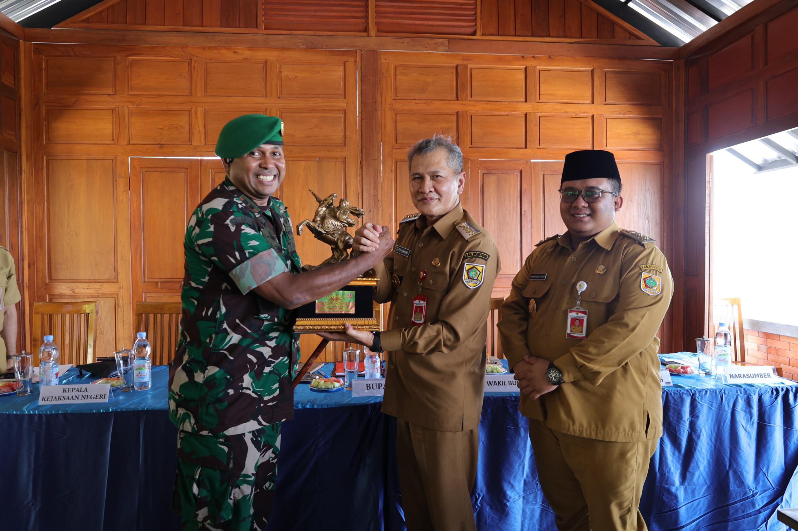 Dan sebagai bentuk terima kasih dan rasa bangga kepada seluruh warga masyarakat Kabupaten Wonogiri, Dandim 0728/Wonogiri Letkol Inf Rodricho Ivan Pattihahuan menyerahkan langsung piala penghargaan kepada masyarakat Wonogiri dan di terima langsung oleh Bupati Wonogiri Setyo Sukarno, Selasa (23/12/2025).