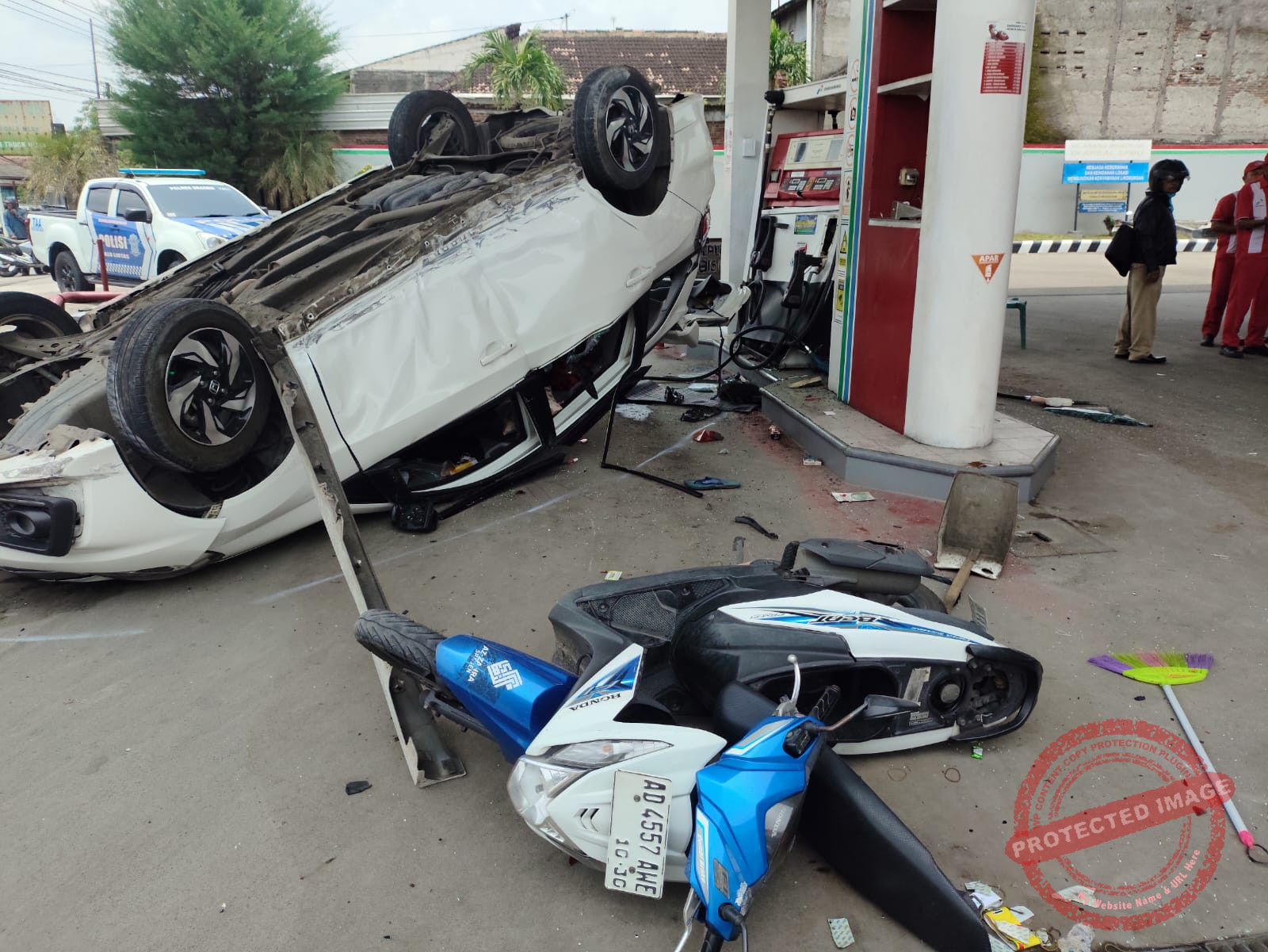 “Mobil kemudian menabrak pembatas taman SPBU hingga terguling. Dalam posisi terguling itu kendaraan membentur sepeda motor yang sedang mengisi BBM serta operator SPBU yang berada di dekat dispenser,” terang AKP Kukuh.