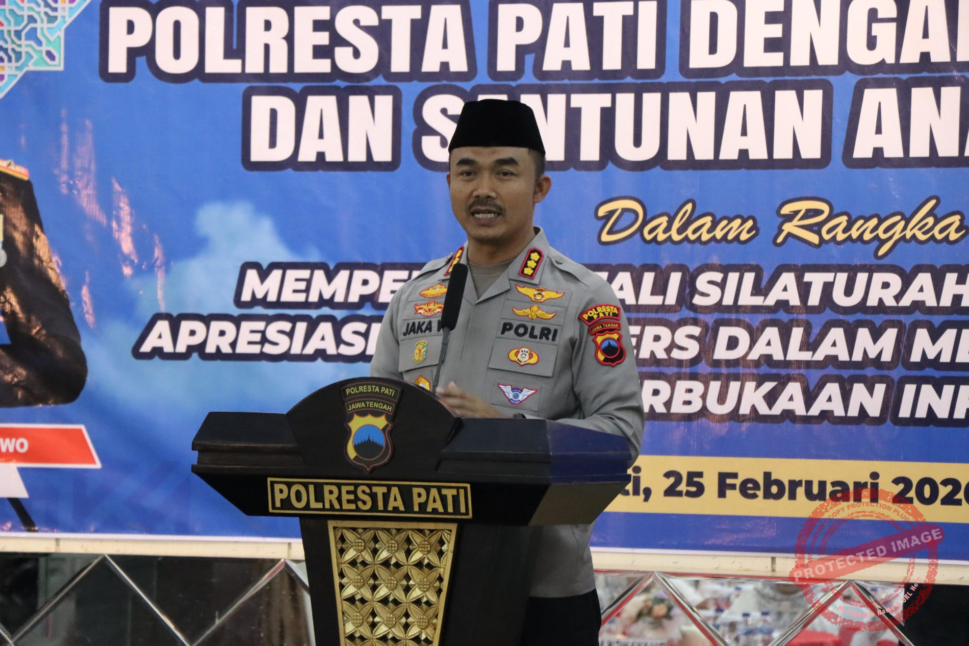 PATI – Suasana hangat dan penuh kebersamaan mewarnai Aula Sarja Arya Racana, Rabu (25/2/2026) pukul 16.00 hingga selesai. Polresta Pati menggelar kegiatan buka puasa bersama insan pers serta santunan anak yatim sebagai wujud silaturahmi dan penguatan sinergitas antara kepolisian dan media.