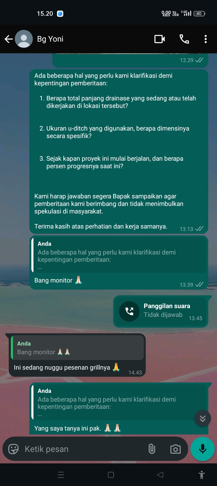 Tim Harianesia.com telah berupaya mengonfirmasi kepada pelaksana proyek bernama Yoni, dengan mengajukan beberapa pertanyaan krusial melalui pesan WhatsApp, yakni: