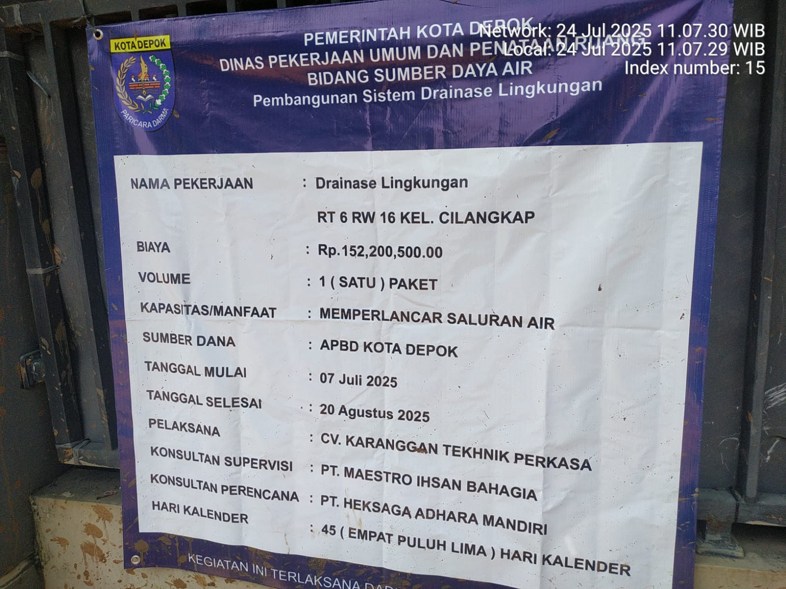 Depok_HARIANESIA.COM_Proyek pembangunan saluran drainase yang berlokasi di Jalan Banjaran Pucung RT 6/RW 16, Perumahan Mutiara, Cimanggis, Kota Depok, menuai sorotan tajam dari publik. Proyek yang dikerjakan oleh CV. Karanggan Teknik Perkasa dengan nilai kontrak mencapai Rp152.200.500 dari APBD Kota Depok ini diduga kuat dilaksanakan tanpa pengawasan yang memadai, serampangan, dan rawan penyimpangan.