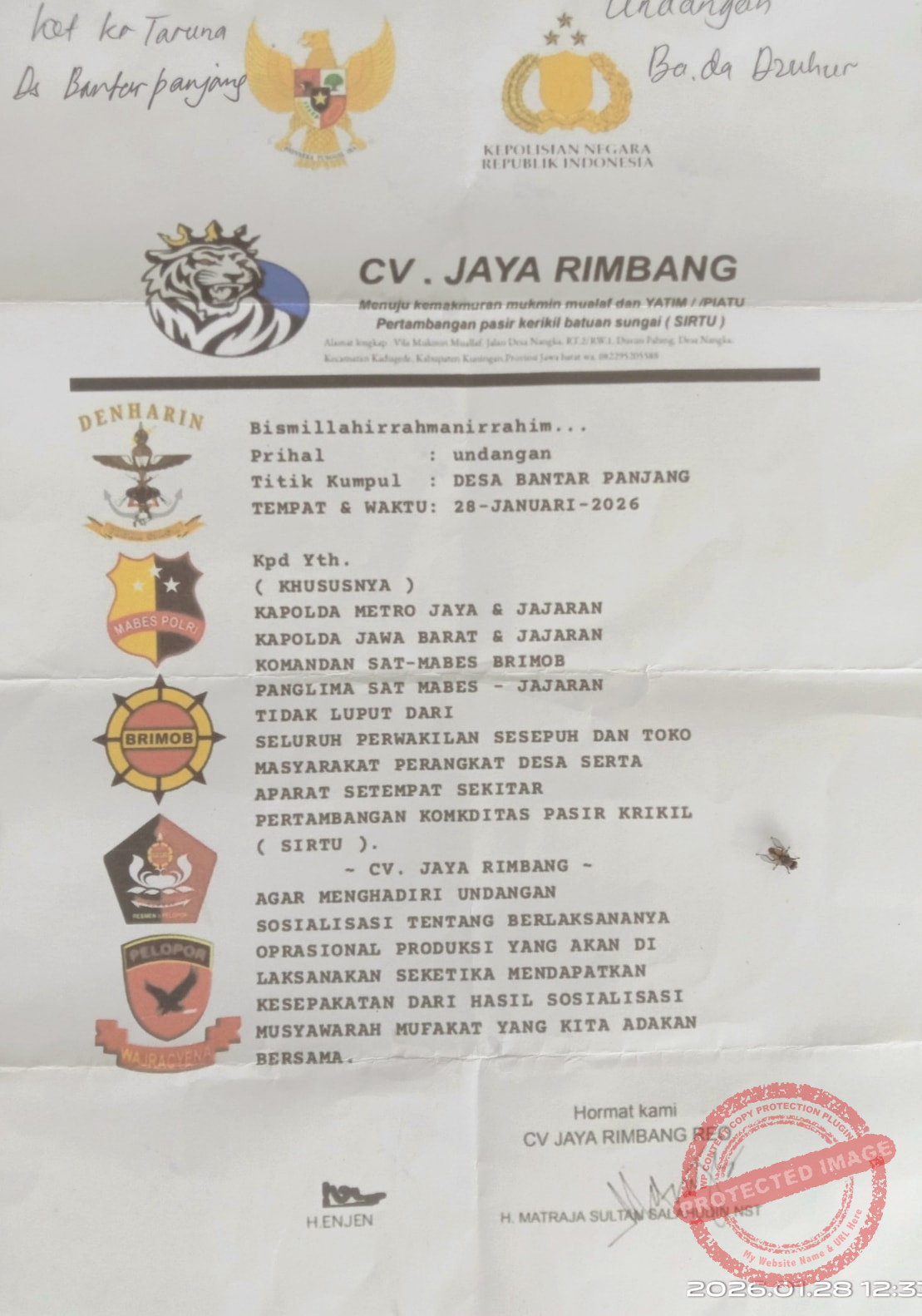 Dalam surat tertanggal 28 Januari 2026 itu tercantum sejumlah logo dan nama satuan seperti DENHARIN, MABES POLRI, BRIMOB, dan PELOPOR. Kegiatan sosialisasi tersebut disebut dilaksanakan oleh CV Jaya Rimbang.