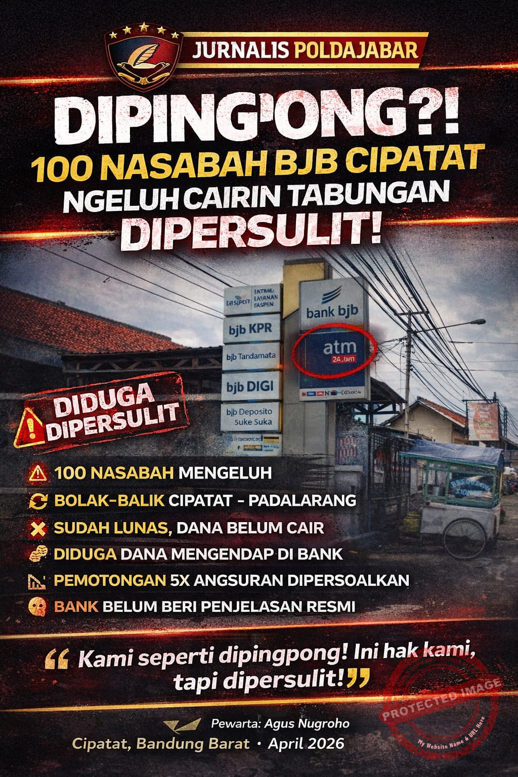 “Saya sudah beberapa kali datang ke KCP Cipatat, tapi seolah-olah dipersulit. Bahkan sempat disuruh ke kantor cabang di Padalarang, tapi di sana malah diarahkan kembali ke Cipatat. Kami jadi seperti dipingpong, padahal itu hak kami,” keluhnya.