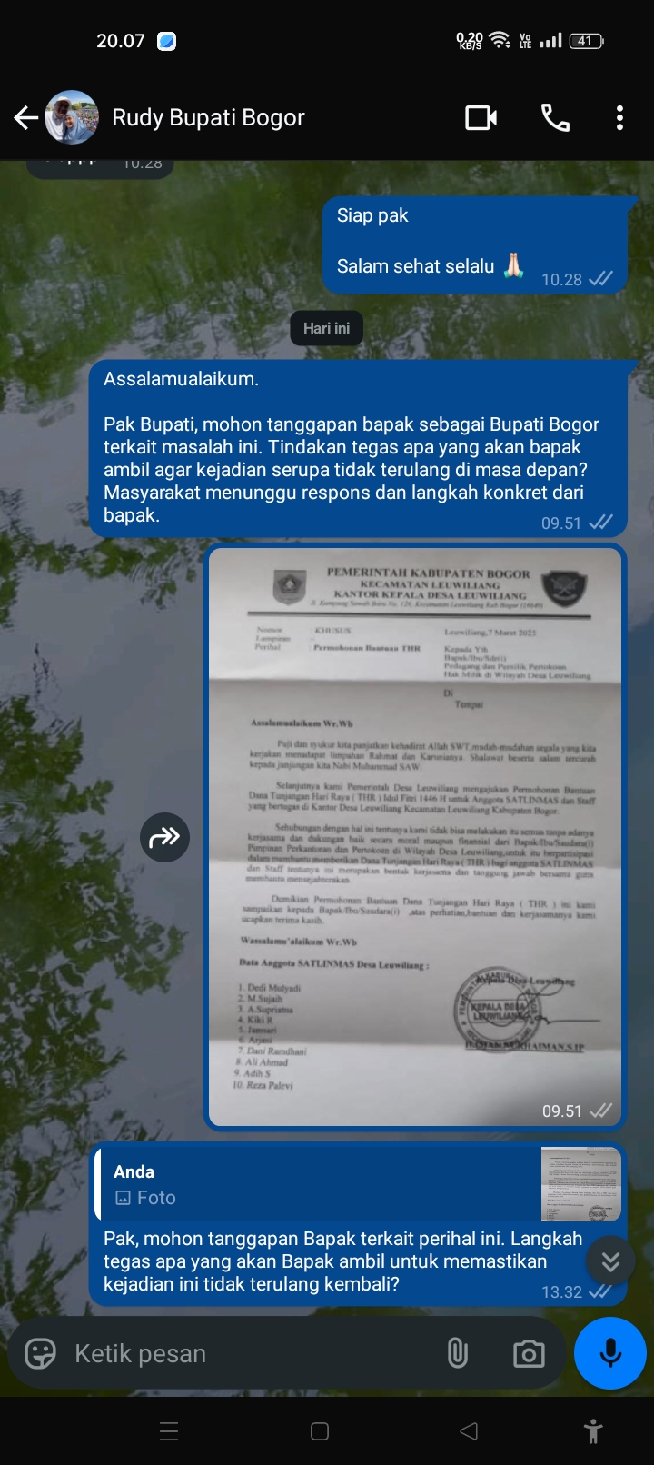 Pasalnya, surat edaran permohonan bantuan THR yang beredar di kalangan pedagang menggunakan stempel basah resmi desa serta diduga dibubuhi tanda tangan Kepala Desa Leuwiliang. Hal ini menimbulkan kecurigaan bahwa pungli tersebut bukan hanya ulah individu, melainkan didukung oleh pejabat desa.