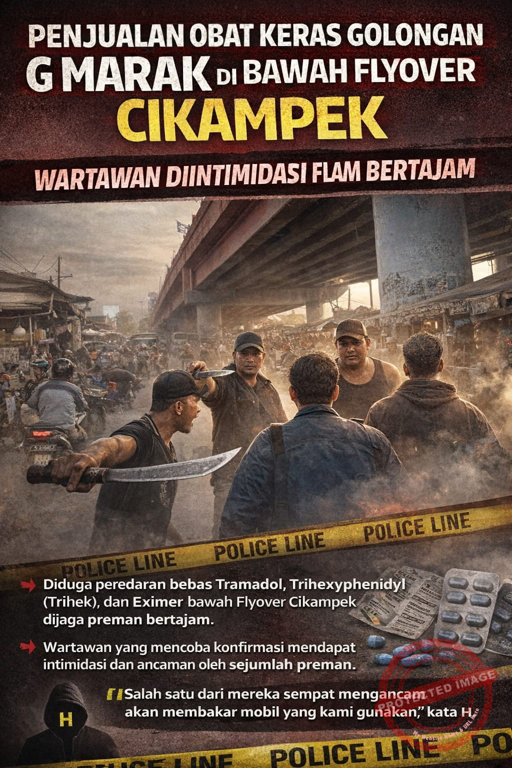 “Awalnya kami mendapat aduan dari masyarakat setempat terkait adanya penjualan obat keras seperti tramadol, trihek, dan eximer di bawah flyover Jalan Pantura. Saat kami datang untuk mencari toko tersebut, beberapa orang langsung menghampiri kami dan melakukan intimidasi serta kekerasan yg di lengkapi sajam. Mereka juga menuduh kami hendak menculik penjaga toko,” ungkap H.