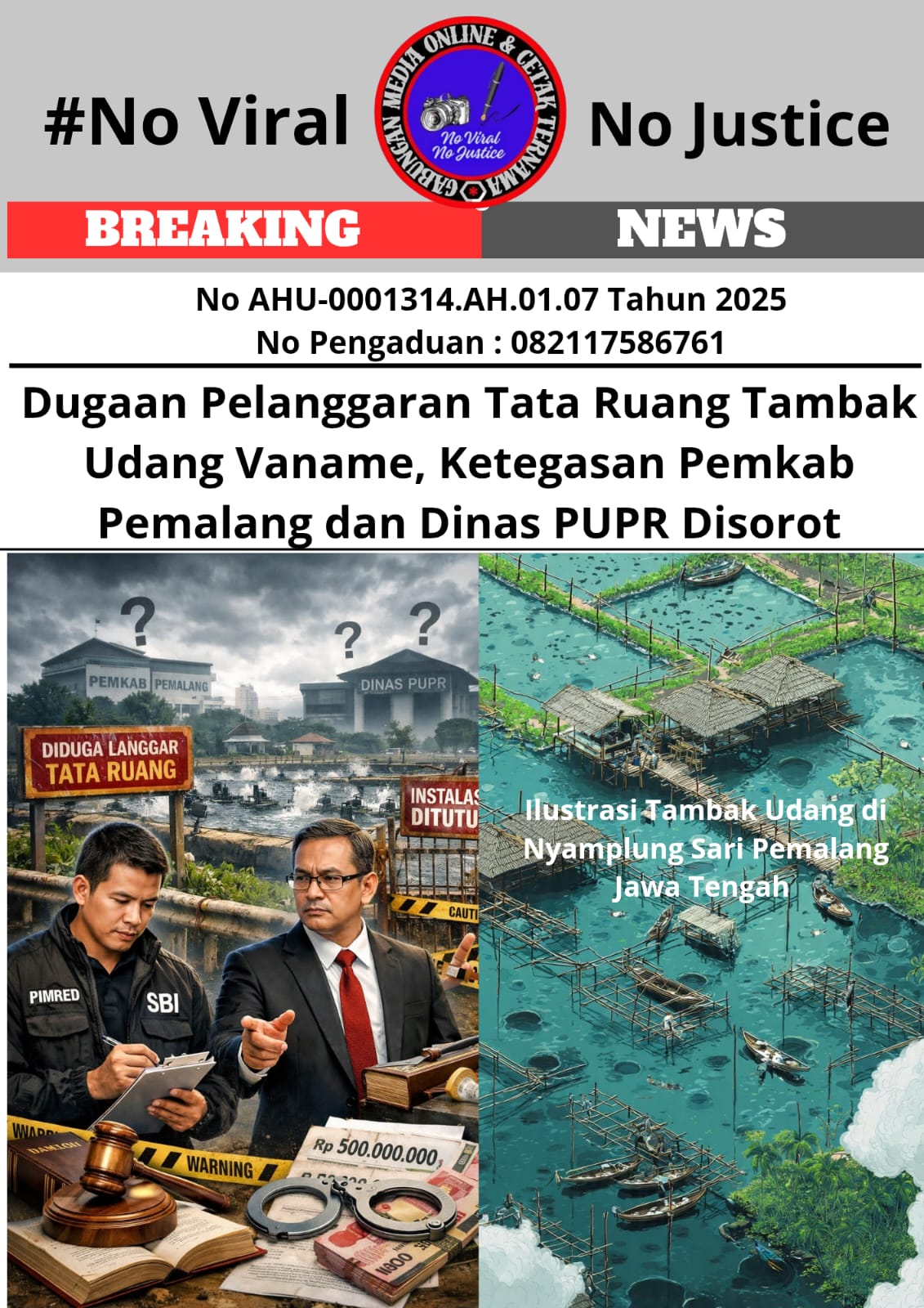 Pemimpin Redaksi SBI, Agung Sulistio, bersama Bambang L.A. Hutapea, S.H., M.H., C.Med, selaku kuasa hukum Kepala Desa Nyamplungsari, Kecamatan Petarukan, Kabupaten Pemalang, secara tegas menyoroti lambannya respons Pemerintah Kabupaten Pemalang dan Dinas Pekerjaan Umum dan Penataan Ruang (PUPR) terkait keberadaan dan aktivitas tambak udang vaname yang diduga melanggar ketentuan tata ruang.