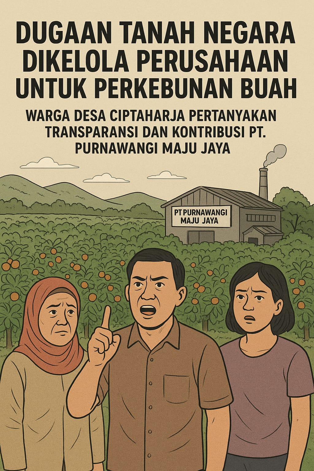 Bandung Barat_HARIANESIA.COM_Masyarakat Desa Ciptaharja, Kecamatan Cipatat, Kabupaten Bandung Barat, ramai memperbincangkan keberadaan lahan perkebunan buah yang dikelola oleh PT. Purnawangi Maju Jaya. Warga menduga, lahan yang kini dijadikan kawasan perkebunan itu merupakan tanah negara, bahkan sekitar 30 persen di antaranya disebut-sebut sebagai tanah hak desa.