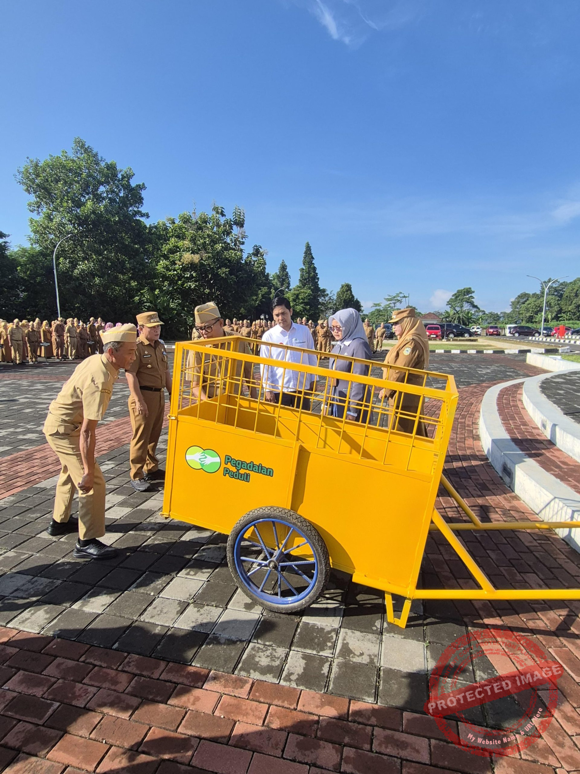 Bantuan diserahkan secara simbolis oleh Pemimpin Cabang PT Pegadaian Kantor Wilayah X Jawa Barat di Kuningan, Maya Anaya, dan diterima langsung oleh Bupati Kuningan, Dr. H. Dian Rachmat Yanuar, M.Si. Rencananya, ke-12 armada ini akan dialokasikan ke berbagai desa yang selama ini belum memiliki fasilitas angkutan sampah memadai untuk menjangkau perumahan warga.
