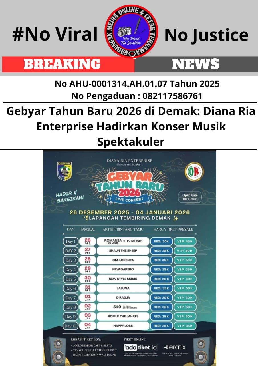 Demak (GMOCT) – Diana Ria Enterprise mempersembahkan “Gebyar Tahun Baru 2026 Live Concert” yang akan digelar di Lapangan Tembiring, Demak, mulai tanggal 26 Desember 2025 hingga 4 Januari 2026. Acara ini menjanjikan hiburan spektakuler dengan menampilkan berbagai artis dan bintang tamu ternama.