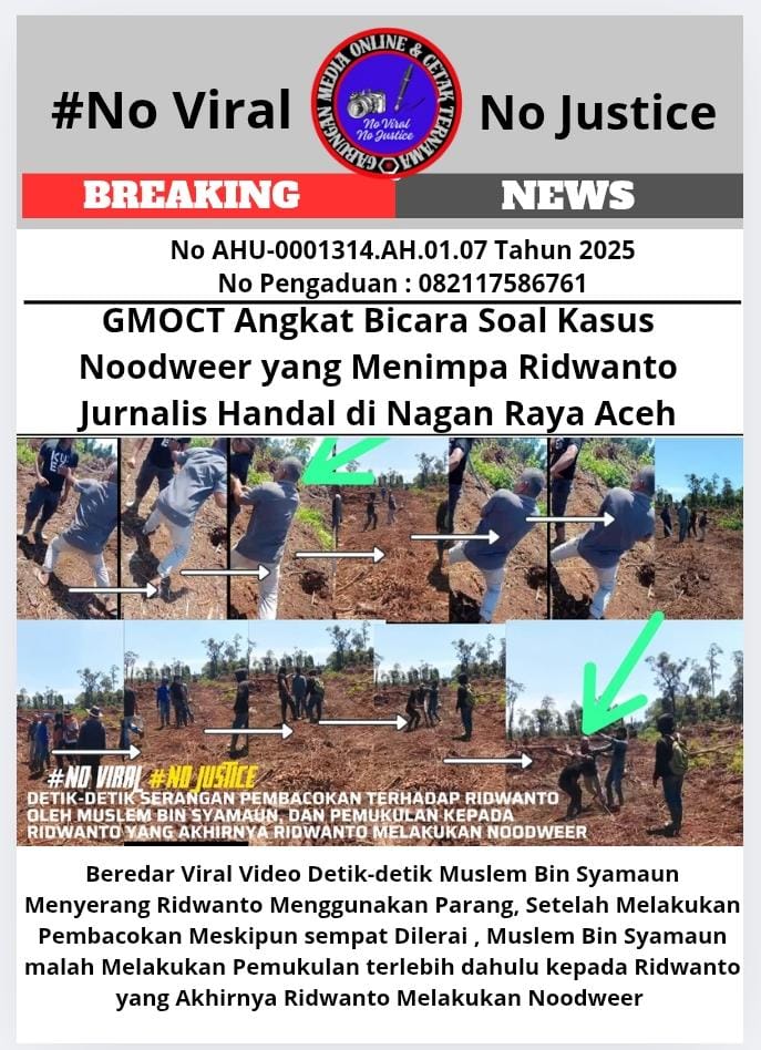 Kabupaten Semarang, DPP Pusat GMOCT 8 November 2025 – Kasus yang menimpa Ridwanto, Ketua DPD GMOCT Provinsi Aceh, yang juga seorang jurnalis, terkait dengan tindakan pembelaan diri (noodweer) menjadi perhatian serius Gabungan Media Online dan Cetak Ternama (GMOCT). Ridwanto mengalami serangan pembacokan pada 18 Agustus 2025 oleh Muslem Bin Syamaun, dan secara spontan melakukan pembelaan diri. Namun, pasca kejadian, Muslem Bin Syamaun justru melaporkan Ridwanto ke Mapolsek Darul Makmur Kabupaten Nagan Raya.