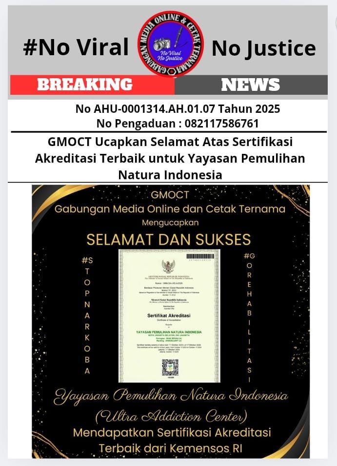Kabupaten Semarang (GMOCT) Kamis 6 Oktober 2025 – Gabungan Media Online dan Cetak Ternama (GMOCT), sebagai mitra publikasi dan edukasi dari Yayasan Pemulihan Natura Indonesia Ultra Addiction Center, mengucapkan selamat atas diraihnya Sertifikasi Akreditasi Terbaik dari Kementerian Sosial Republik Indonesia (Kemensos RI) kepada yayasan tersebut.