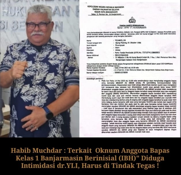 Selanjutnya Habib Muchdar menambahkan” Adanya tindakan intimidasi yang dilakukan oleh Petugas Bapas Kelas 1 berinisial (IBH) tidak dibenarkan secara hukum, untuk itu Habib Muchdar berharap supaya pihak kepolisian Polresta Banjarmasin agar segera memproses secara tegas oknum (IBH)terhadap pengaduan korban dr.YLI dan hal ini penting sebagai upaya penegakan hukum yang cepat dan komprehensif, khususnya di Kota Banjarmasin” Tutupnya.