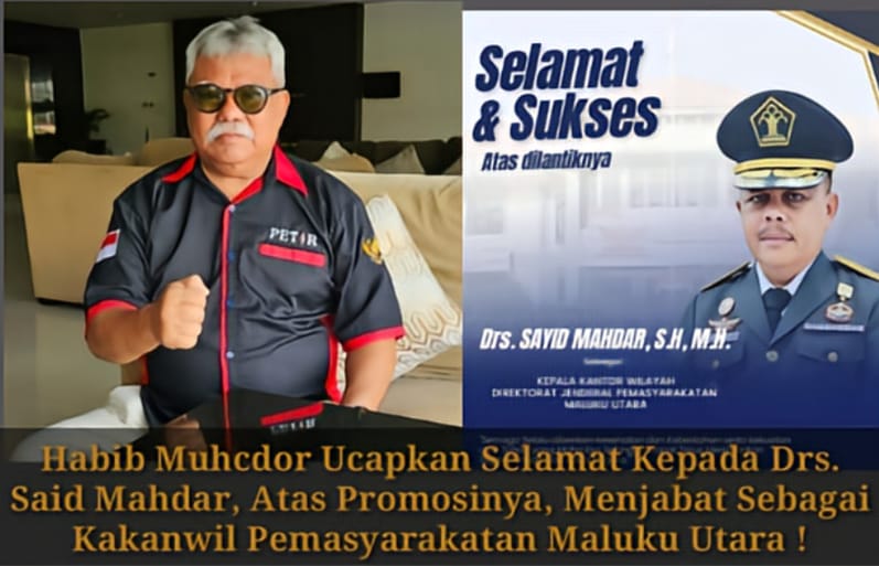 Jakarta – Pemerhati Publik dan Kebijakan Hukum” Habib Muchdor Hasan Assegaf, mengucapkan Selamat dan Sukses kepada Bapak Drs. Said Mahdar, S.H., M.H, yang mana sebentar lagi akan menjabat sebagai Kepala Kantor Wilayah (Kakanwil) Pemasyarakatan Maluku Utara ” Ujarnya Rabu 14 Januari 2025.