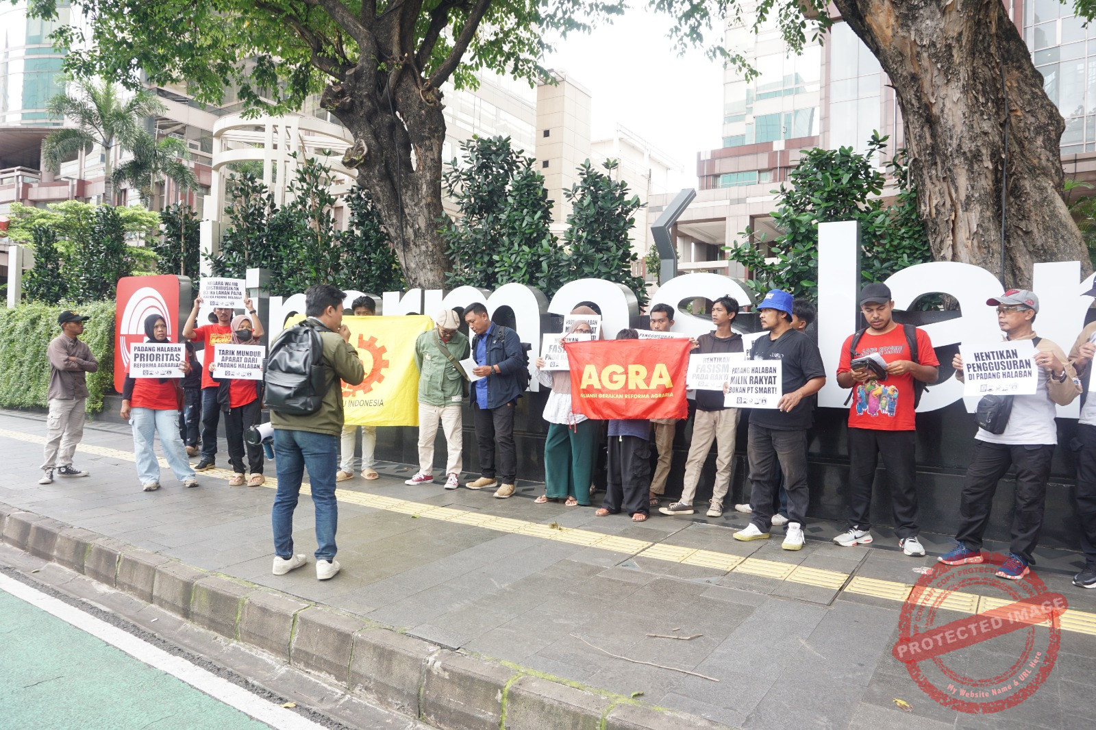 Jakarta, 28 Januari 2028 : menyikapi penggusuran berkedok eksekusi lahan putusan pengadilan yang tengah berlangsung di padang Halaban Kabupaten Labuhan Batu – Sumatera utara oleh Pengadilan Tinggi Rantau Prapat atas permohonan PT. Sinar Mas Agro Resources and Technology (SMART) yang mendapatkan pengawalan oleh 600 lebih aparat Gabungan, puluhan massa aksi dari Aliansi Gerakan Reforma Agraria (AGRA), Gabungan Serikat Buruh Indonesia (GSBI), Gerakan Mahasiswa Nasional Indonesia (GMNI), Front Mahasiswa Nasional (FMN) dan Pemuda Baru (Pembaru) Jakarta mengadakan aksi solidaritas respon cepat di depan Kantor PT. Sinarmas di jalan Thamrin City- Jakarta Pusat.