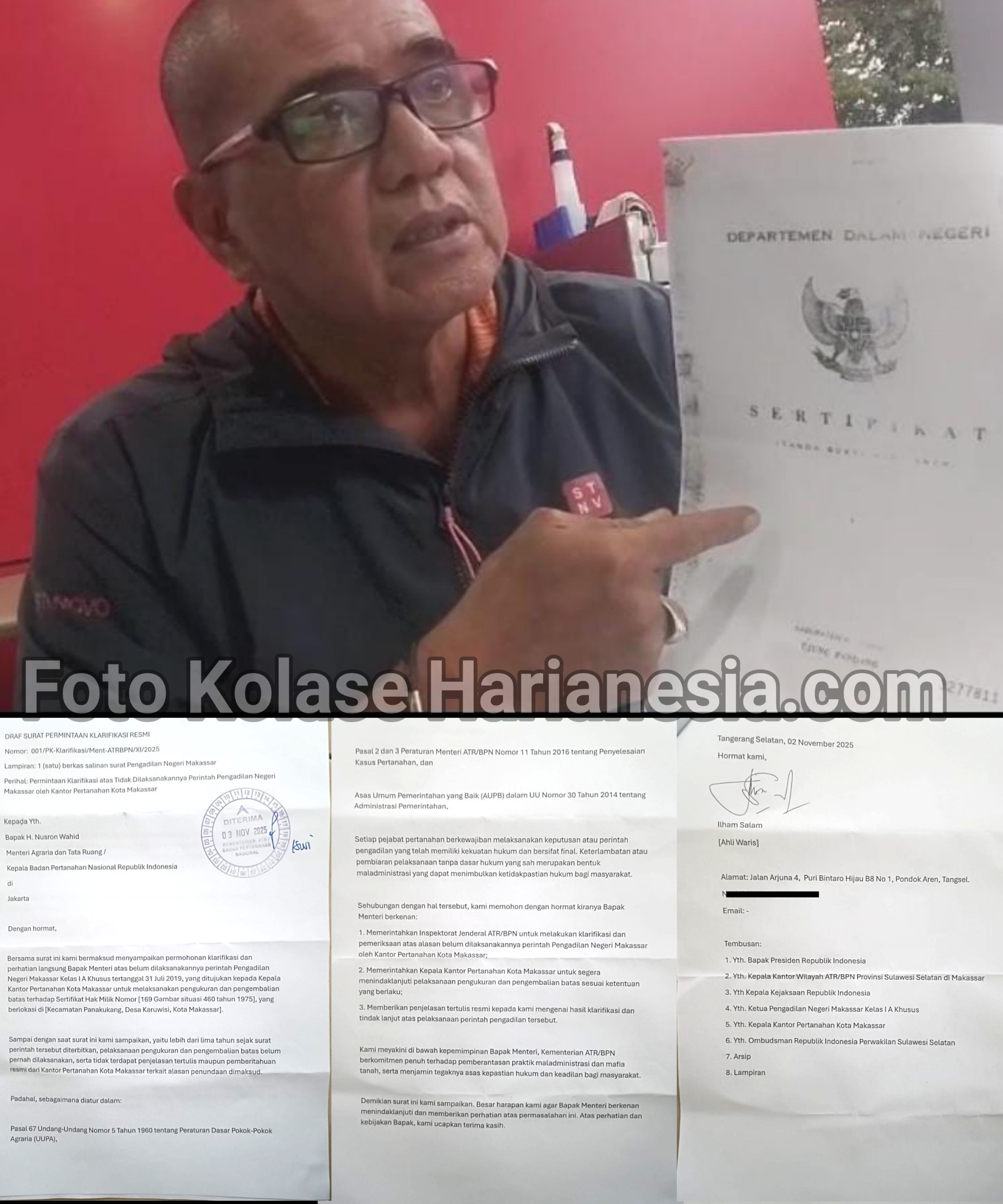 dan saat ini saya kembali ke Jakarta ke Kementrian ATR / BPN Memberikan surat agar Kementrian ATR/BPN, mau menangani secara serius terhadap kasus yang saya hadapi sekarang.