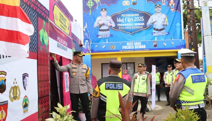 Demak – Kapolres Demak, AKBP Ari Cahya Nugraha, didampingi Ketua Bhayangkari Cabang Demak, Ny. Victoria Ari, mengunjungi Pos Pengamanan Lebaran Idul Fitri 1446 Hijriyah di wilayah Kabupaten Demak, Sabtu (29/3/2025).