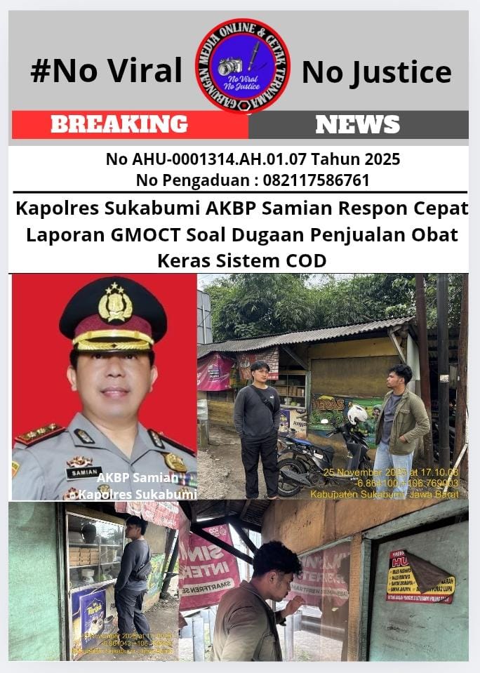 Sukabumi, 25 November 2025 – Pasca viralnya pemberitaan di puluhan media online yang tergabung dalam Gabungan Media Online dan Cetak Ternama (GMOCT) dengan judul “Dugaan Penjualan Obat Keras Sistem COD di Sukabumi Resahkan Warga, Disinyalir Oknum APH Terlibat,” Kapolres Sukabumi AKBP Samian S.H., S.I.K., Msi merespon cepat laporan informasi tersebut.