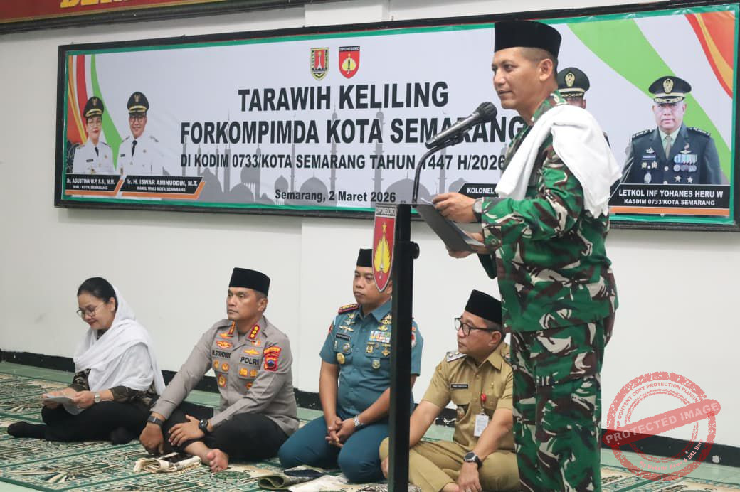 Dalam sambutannya, Dandim 0733/KS menyampaikan apresiasi atas sinergi Pemerintah Kota Semarang dan Forkopimda dalam menyelenggarakan Tarawih Keliling di Makodim 0733/KS. Ia menegaskan bahwa kegiatan tersebut bukan sekadar ibadah bersama, tetapi juga momentum memperkuat komunikasi dan soliditas antar unsur pimpinan daerah dalam menghadapi berbagai tugas ke depan.