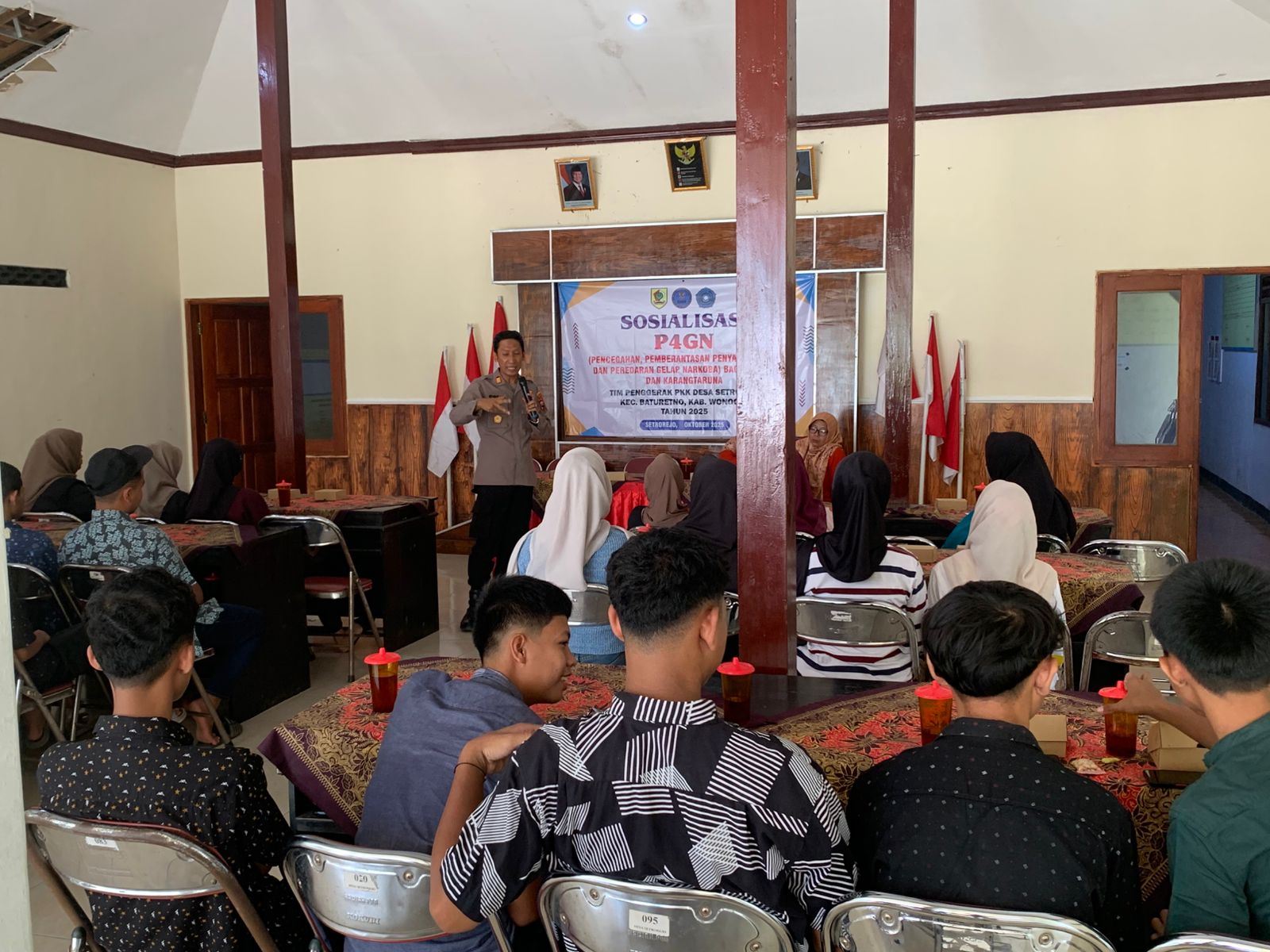 Wonogiri – Upaya pencegahan penyalahgunaan narkoba terus digalakkan oleh jajaran Polres Wonogiri. Kali ini, Polsek Baturetno menyasar kelompok remaja dan ibu-ibu PKK dalam kegiatan sosialisasi bertajuk Pencegahan, Pemberantasan, Penyalahgunaan dan Peredaran Gelap Narkoba (P4GN) yang digelar di Balai Desa Setrorejo, Kecamatan Baturetno, Sabtu (18/10/2025).