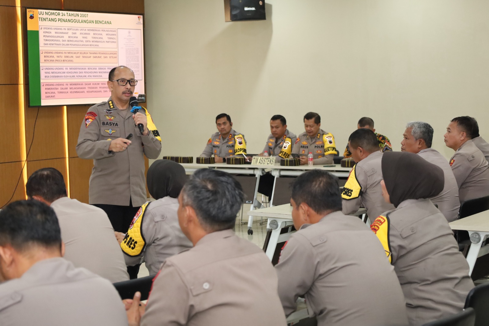 Karo Ops Kombes Pol Basya Radyananda dalam arahannya menekankan bahwa penanggulangan bencana bukan pekerjaan yang dilakukan tanpa pedoman, melainkan tugas yang berlandaskan aturan jelas.