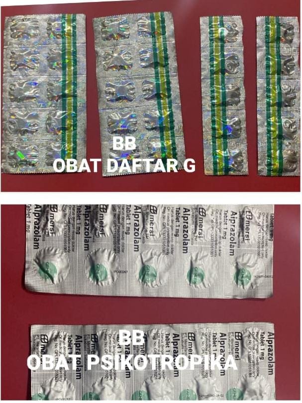Sat Resnarkoba Polresta Banyumas ungkap kasus tindak pidana barang siapa secara tanpa hak memiliki, menyimpan dan/atau membawa Psikotropika atau setiap orang yang tidak memiliki keahlian dan kewenangan tetapi melakukan praktik kefarmasian yang terkait dengan sediaan farmasi berupa obat keras sebagaimana dimaksud dalam pasal 62 Undang Undang RI. No. 5 tahun 1997 tentang Psikotropika atau pasal 436 ayat (2) Undang Undang RI No.17 tahun 2023 tentang Kesehatan.