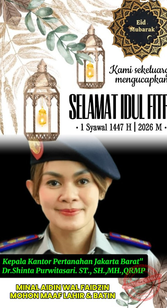 Lebih lanjut Kepala Kantor Pertanahan Jakarta Barat” Dr.Shinta Purwitasari. ST., SH.,MH.,QRMP Beserta Jajaran mengucapkan” Selamat Hari Raya Idul Fitri 1447.H” Mohon Maaf Lahir dan Batin, dengan hati yang tulus saya pribadi bersama pengurus menyampaikan mohon maaf atas segala kesalahan yang pernah terjadi.