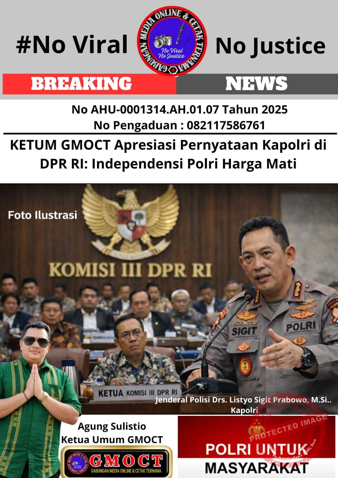 Semarang, Rabu (28 Januari 2026) – Ketua Umum Gabungan Media Online dan Cetak Ternama (GMOCT) Agung Sulistio menyampaikan apresiasi dan dukungan penuh terhadap sikap tegas Jenderal Listyo Sigit Prabowo yang menolak wacana penempatan Kepolisian Negara Republik Indonesia (Polri) di bawah kementerian. Informasi ini diperoleh dari media online Sahabat Bhayangkara Indonesia (Kabarsbi.com) yang tergabung dalam GMOCT.