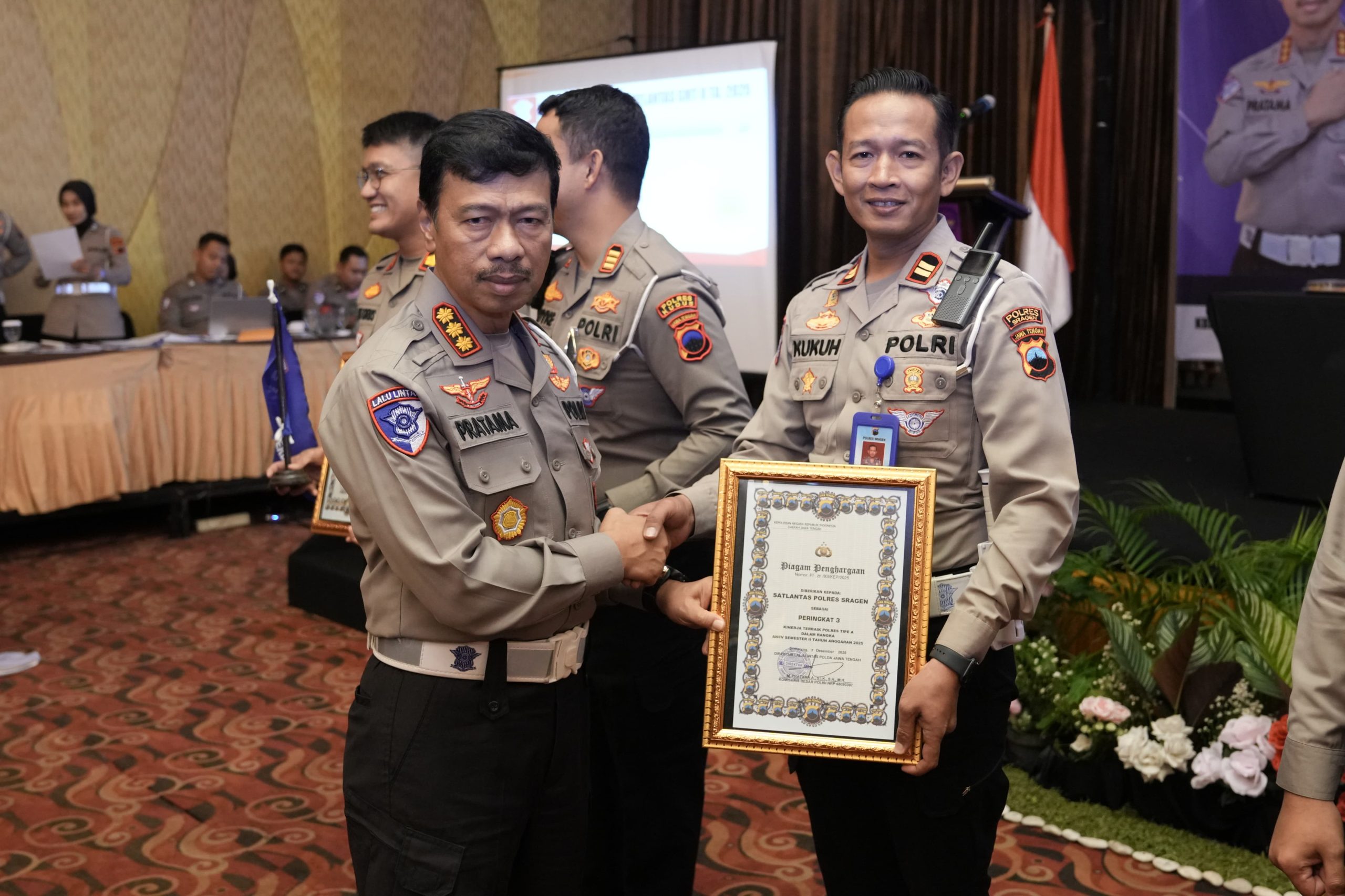 Sragen, Jateng – Kinerja gemilang kembali ditorehkan Satlantas Polres Sragen dalam momentum Analisa dan Evaluasi (Anev) Semester II T.A. 2025 serta Anev Operasi Zebra Candi 2025 yang digelar Ditlantas Polda Jawa Tengah di Ballroom Quest Hotels Semarang, Kamis (04/12/2025).