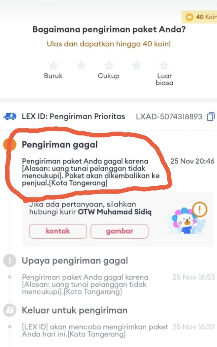 Namun pada sore hari, HR menerima notifikasi dari aplikasi Lazada yang menyatakan bahwa pengiriman gagal dan paket otomatis dikembalikan ke penjual. Lazada menyebut kurir telah mencoba mengantar pesanan namun tidak berhasil.