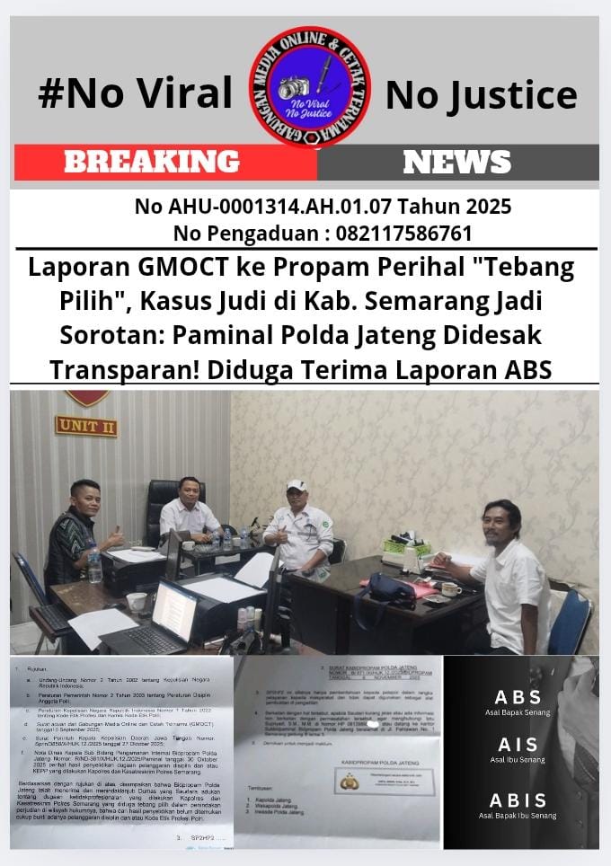 Kab. Semarang _ Kasus dugaan “tebang pilih” dalam penindakan perjudian di Kabupaten Semarang kembali mencuat dan menjadi sorotan tajam. Pasca menerima surat dari Bidpropam Polda Jateng terkait laporan dari Gabungan Media Online dan Cetak Ternama (GMOCT) perihal dugaan penindakan yang tidak merata oleh Satresmob Polres Semarang, GMOCT merasa ada kejanggalan dalam proses penyelidikan.