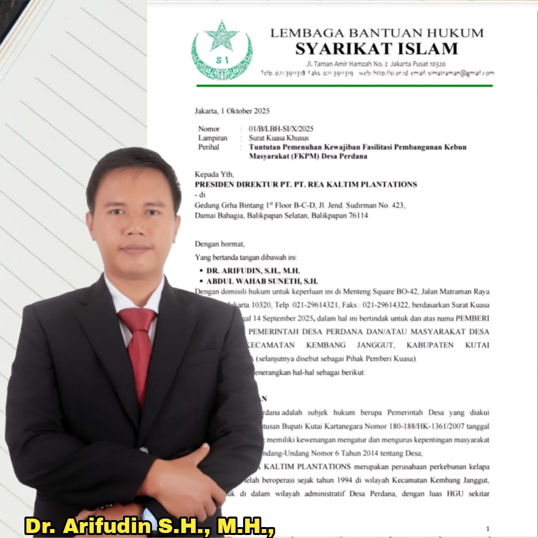 Somasi tersebut dilayangkan pada Rabu (1/10/2025) oleh tim kuasa hukum dari LBH Syarikat Islam atas nama masyarakat Desa Perdana. Mereka menuntut PT. Rea Kaltim untuk segera memfasilitasi pembangunan kebun plasma bagi masyarakat Desa Perdana dan sekitarnya.