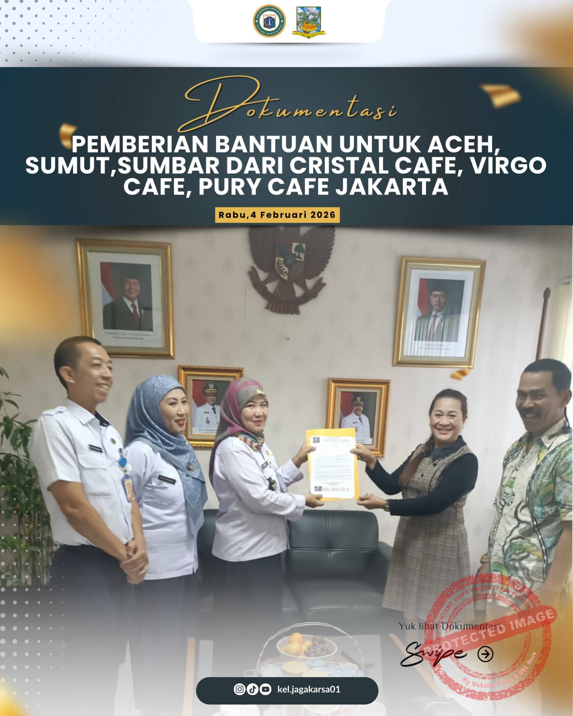 Lebih lanjut Lisa Andina menyampaikan” Donasi yang terkumpul ini kami sepakati dan kami salurkan di kantor Kelurahan Jagakarsa yang diwakili Ibu Yusriati di mana bantuan tersebut diterima langsung oleh beliau sebagai perwakilan dari Pemerintah” Ucap Lisa .