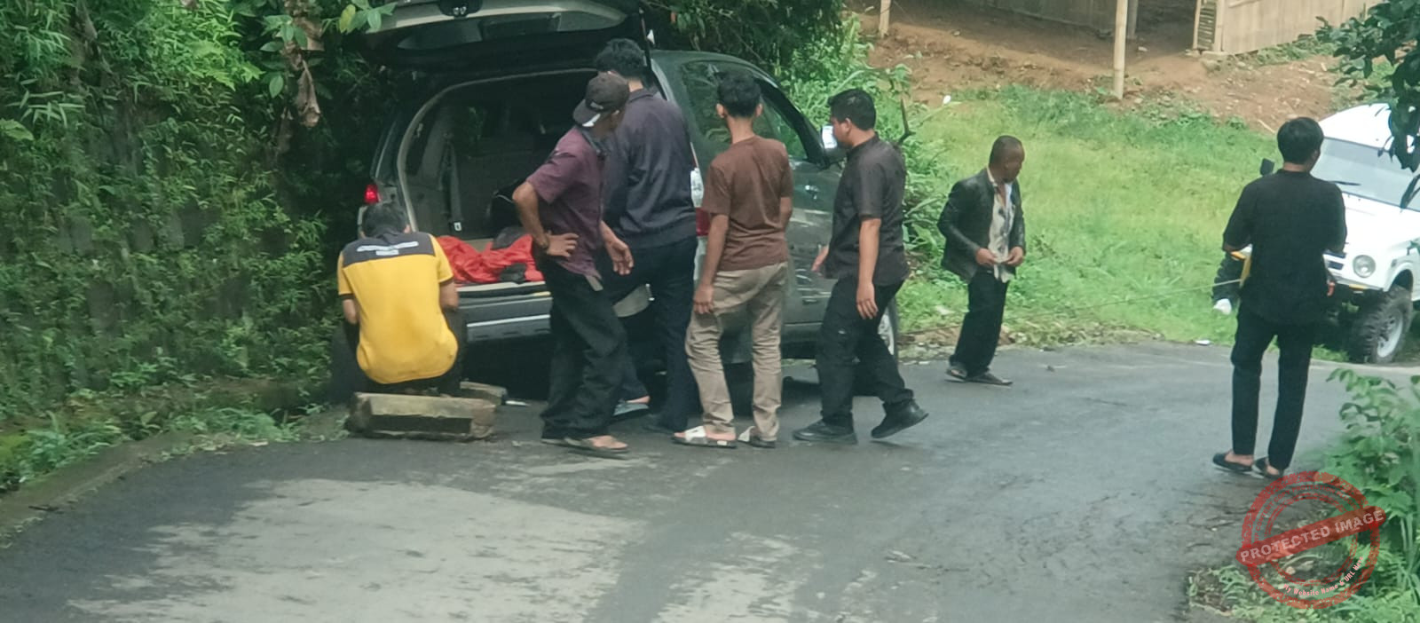 Bhabinkamtibmas bersama warga setempat pun membantu penanganan mobil terperosok ke saluran air yang berlokasi di jalur tanjakan Ciroang Kampung Wangun RT. 03/09 Desa Karang Tengah, Kecamatan Babakan Madang, Kabupaten Bogor.