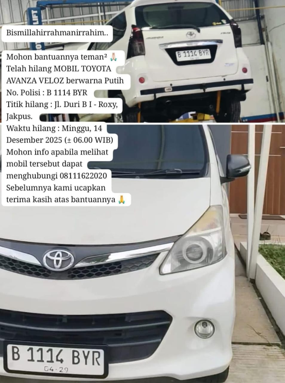 Informasi kehilangan disampaikan pihak keluarga melalui unggahan yang disertai foto kendaraan dari beberapa sudut. Mobil tersebut menggunakan nomor polisi B 1114 BYR, dengan ciri khas Avanza Veloz warna putih, tampilan standar pabrikan, serta kondisi kendaraan yang sebelumnya dalam keadaan baik.