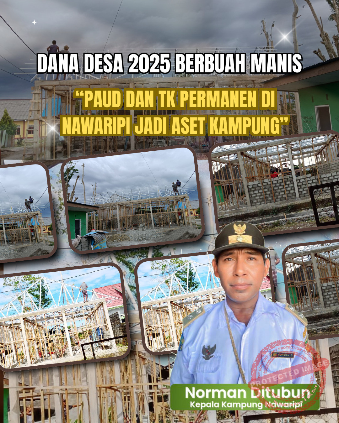 “Sebelumnya kami meminjam bangunan atau tempat milik warga untuk proses belajar mengajar. Sekarang pembangunan sepenuhnya menggunakan Dana Desa Nawaripi Tahun Anggaran 2025, dan gedung ini menjadi aset permanen kampung,” ujarnya.