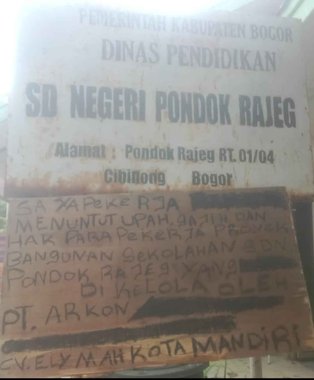Bogor – Harianesia – Puluhan pekerja buruh bangunan dari CV Elly Mahkota Mandiri melakukan aksi protes dengan cara menyegel sekolah SD Negri Pondok Rajeg Cibinong Kabupaten Bogor. Penyegelan tersebut dilakukan para pekerja, buntut dari tidak dibayarkannya upah kerja mereka oleh CV Elly Mahkota Mandiri sebagai pemenang tender Pembangunan Ruang Kelas Baru SDN Pondok Rajeg Kecamatan Cibinong.