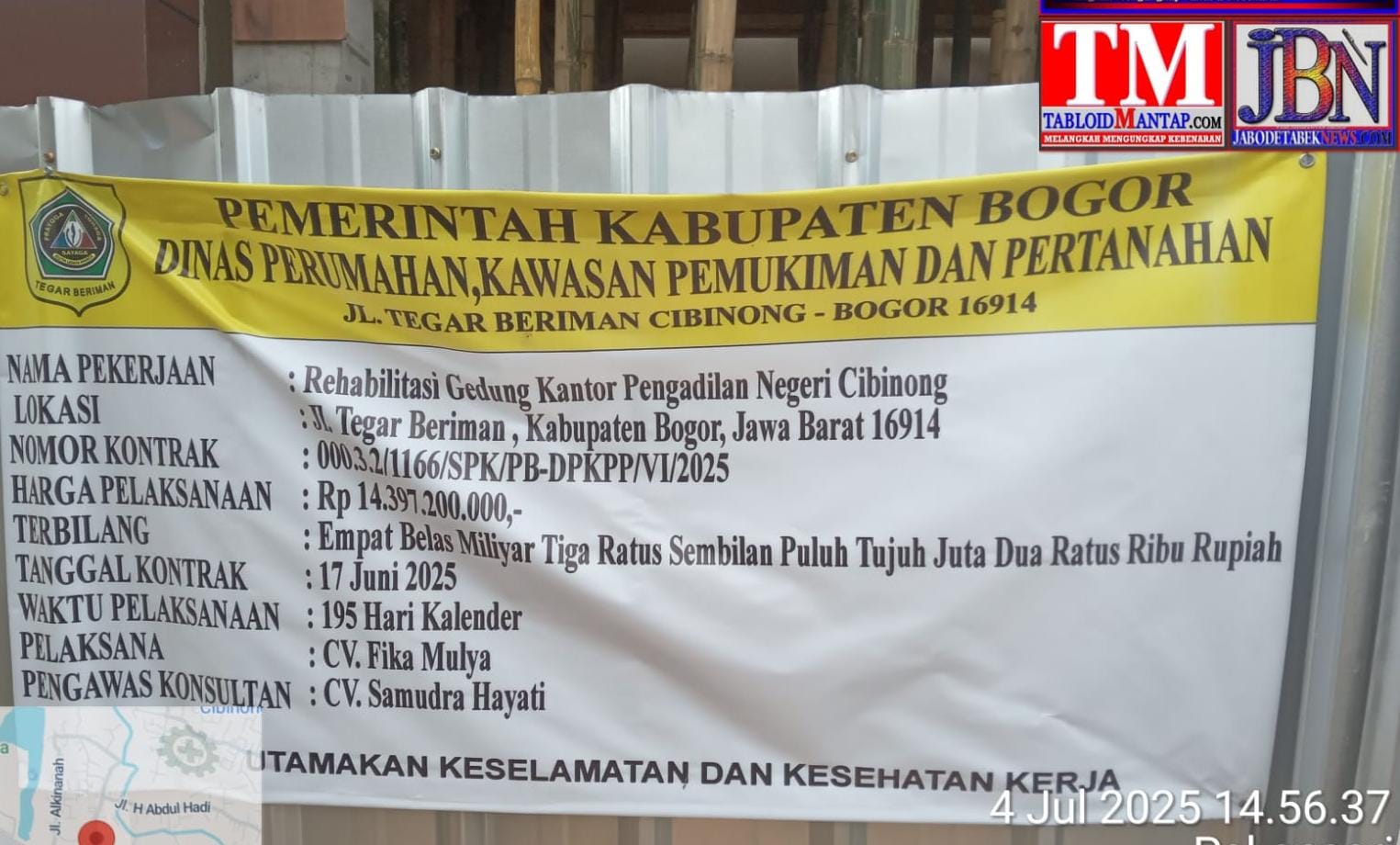 Sebagai informasi, proyek rehabilitasi gedung kantor Pengadilan Negeri Cibinong merupakan proyek dari Dinas Perumahan, Kawasan Pemukiman dan Pertanahan (DPKPP) Kabupaten Bogor dengan Anggaran Rp. 14.397.200.000,- dikerjakan oleh kontraktor CV. Fika Mulya dan diawasi Konsultan dari CV. Samudera Hayati dengan durasi pekerjaan selama 195 Hari kalender kerja. (RDI/Pendi)