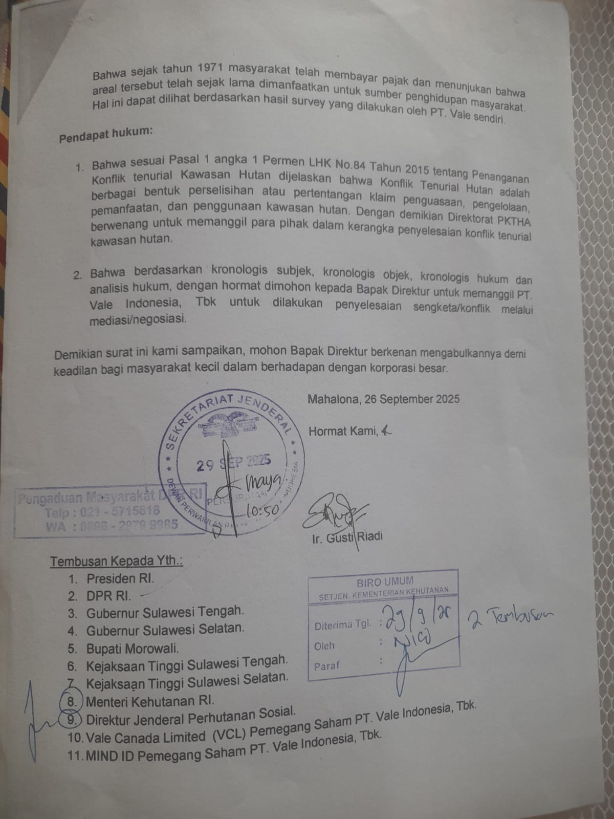 Sulsel – Pemilik Tanam Tumbuh terletak di Bahodopi Blok 1 (BB1) PT Vale Indonesia kini resmi mengadu ke Kementerian Kehutanan Republik Indonesia.