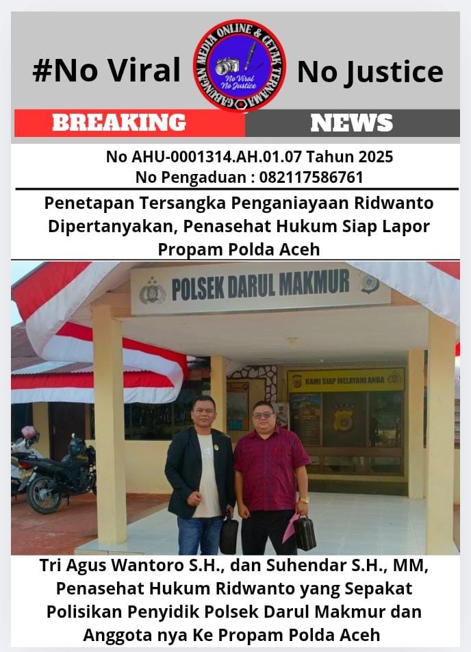 Nagan Raya (GMOCT) Kamis 6 November 2025 – Penetapan Ridwanto sebagai tersangka penganiayaan terhadap Muslem bin Syamaun, yang diduga melanggar Pasal 351 Kitab Undang-Undang Hukum Pidana (KUHP), oleh penyidik Polsek Darul Makmur kembali menuai sorotan. Penasihat hukum Ridwanto dari Kantor Hukum Adil Bangsa Yustisia mempertanyakan dasar penetapan tersebut. Kamis, 6 November 2025.