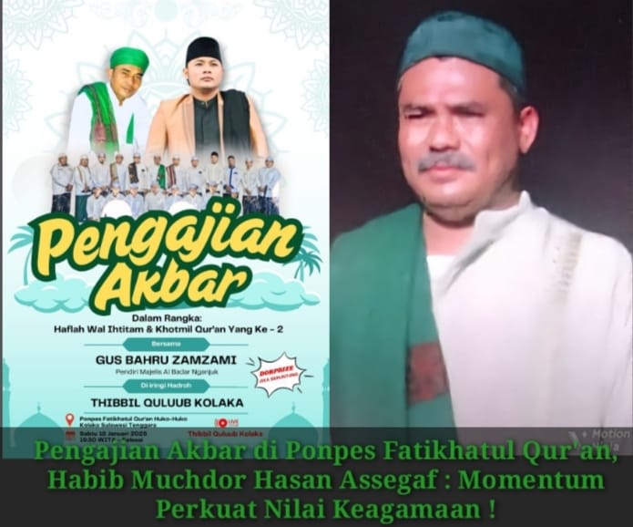 Sebagai mana di ketahui Pondok Pesantren Fatikhatul Qur’an, akan menggelar Pengajian Akbar dalam rangka Wal Ihtitam & Khotmil Qur’an Yang Ke-2, yang mana acara tersebut turut dihadiri Pendiri Albadar Nganjuk Gus Bahru Zamzami, serta di iringi Hadroh Thibbil Quluub Kolaka, diselenggarakan bertempat di Huko – Huko Kolaka Sulawesi Selatan, pada Sabtu 18 Januari 2025 pukul 19.30 WIT, hingga selesai.