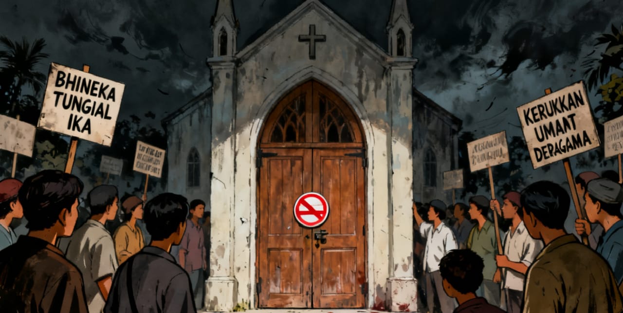 Bogor – Bayangkan: setiap hari, Anda harus berjalan jauh untuk beribadah, atau menyembunyikan tempat ibadah Anda karena takut ditolak. Ini bukan cerita fiksi – ini adalah kenyataan yang dihidupi umat minoritas di berbagai pelosok Indonesia. Bagi mereka, semboyan “Bhinneka Tunggal Ika” tidak lagi menjadi janji kebhinekaan yang hidup – melainkan sebuah catatan sejarah yang semakin memudar, tertutup oleh bayangan satu peraturan yang kejam: Peraturan Bersama (Perber) Mentri Agama dan Mentri Dalam Negeri No. 8 & 9 Tahun 2006.