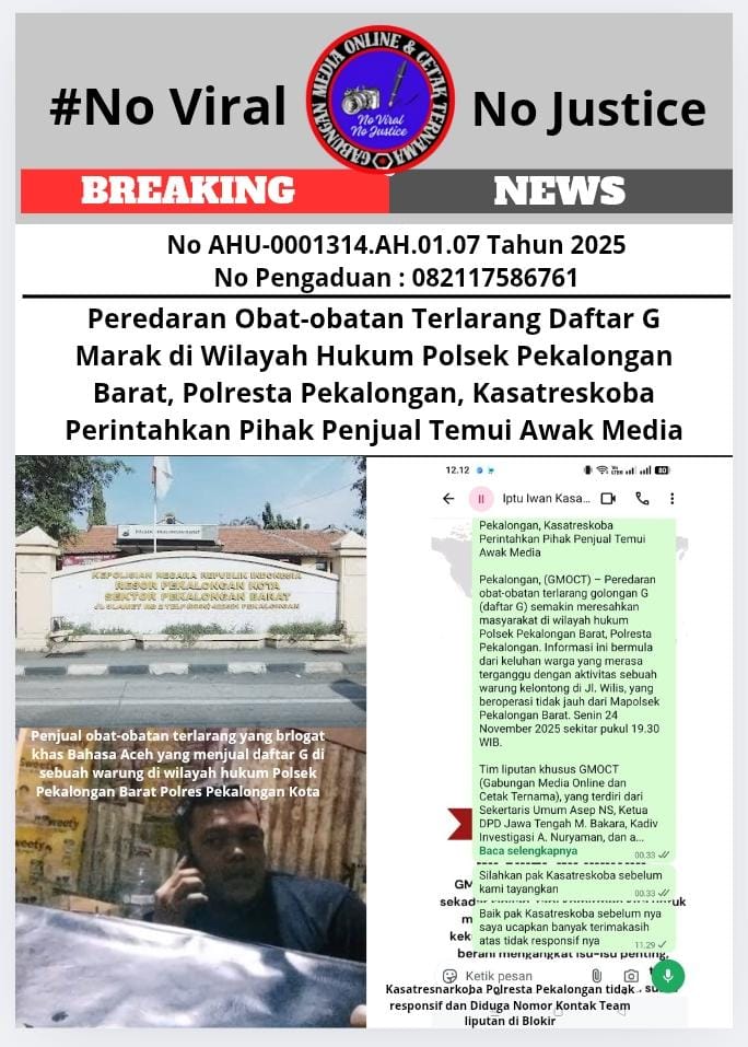 Pekalongan Kota– Peredaran obat-obatan terlarang golongan G (daftar G) semakin meresahkan masyarakat di wilayah hukum Polsek Pekalongan Barat, Polresta Pekalongan. Informasi ini bermula dari keluhan warga yang merasa terganggu dengan aktivitas sebuah warung kelontong di Jl. Wilis, yang beroperasi tidak jauh dari Mapolsek Pekalongan Barat. Senin 24 November 2025 sekitar pukul 19.30 WIB.