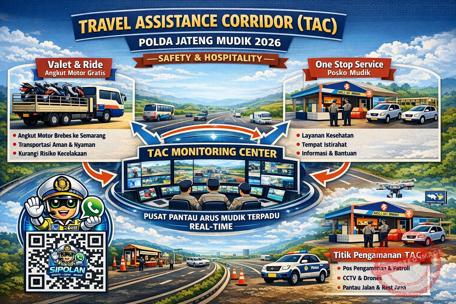 Untuk memudahkan masyarakat memperoleh informasi perjalanan, Polda Jateng juga menghadirkan Chat Sipolan (Sistem Informasi Polantas Polda Jateng), layanan berbasis kecerdasan buatan (AI) yang dapat diakses melalui WhatsApp selama 24 jam. Melalui layanan ini, masyarakat dapat memperoleh informasi kondisi lalu lintas, jalur alternatif, lokasi rest area, pos pelayanan, hingga kontak darurat yang terintegrasi dengan Call Center 110 Polri.