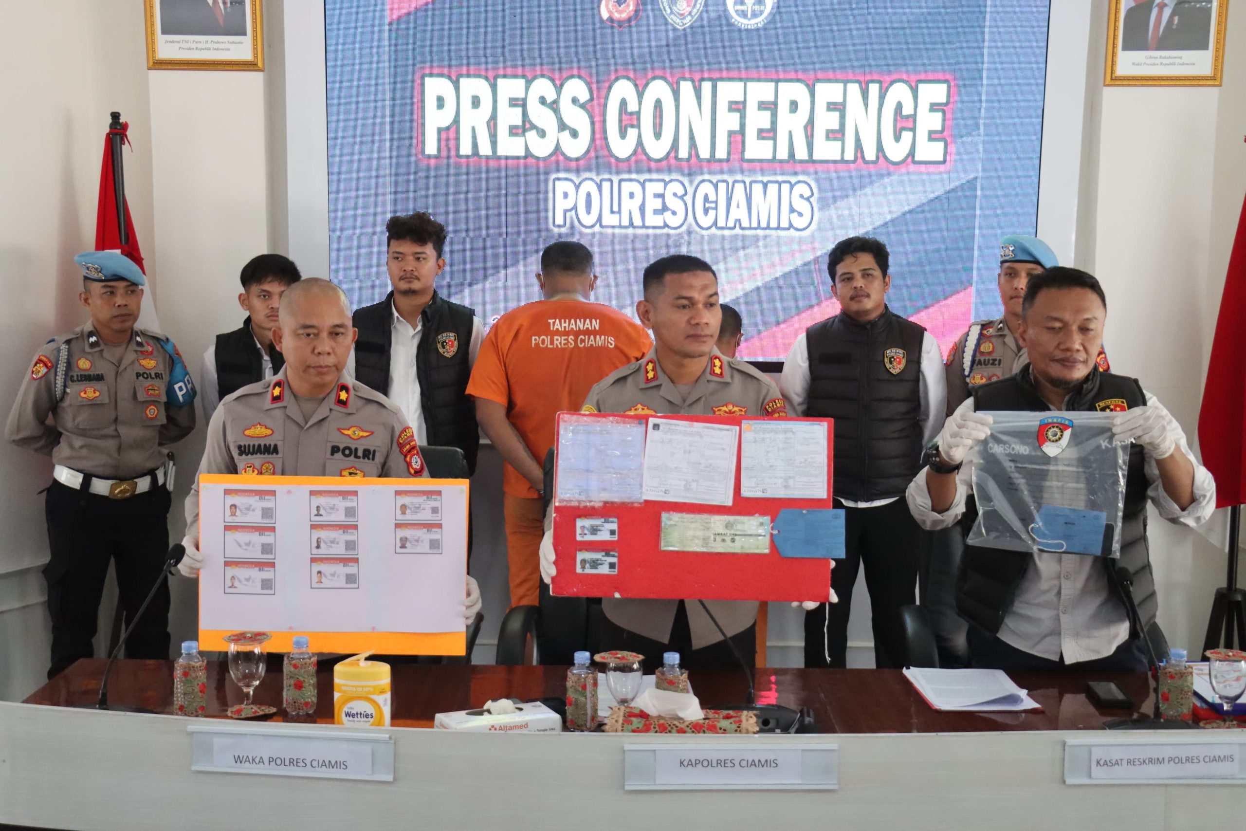 Polres Ciamis kembali menunjukkan komitmennya dalam menegakkan hukum dan menjaga ketertiban masyarakat. Melalui kegiatan konferensi pers yang digelar pada Senin (26/5/2025), Kapolres Ciamis AKBP Akmal, S.H., S.I.K., M.H. didampingi oleh Wakapolres Kompol Sujana, S.Pd., dan Kasat Reskrim AKP Carsono, S.H. mengumumkan keberhasilan pengungkapan kasus tindak pidana pemalsuan surat, khususnya pembuatan dan penggunaan SIM B II Umum palsu.