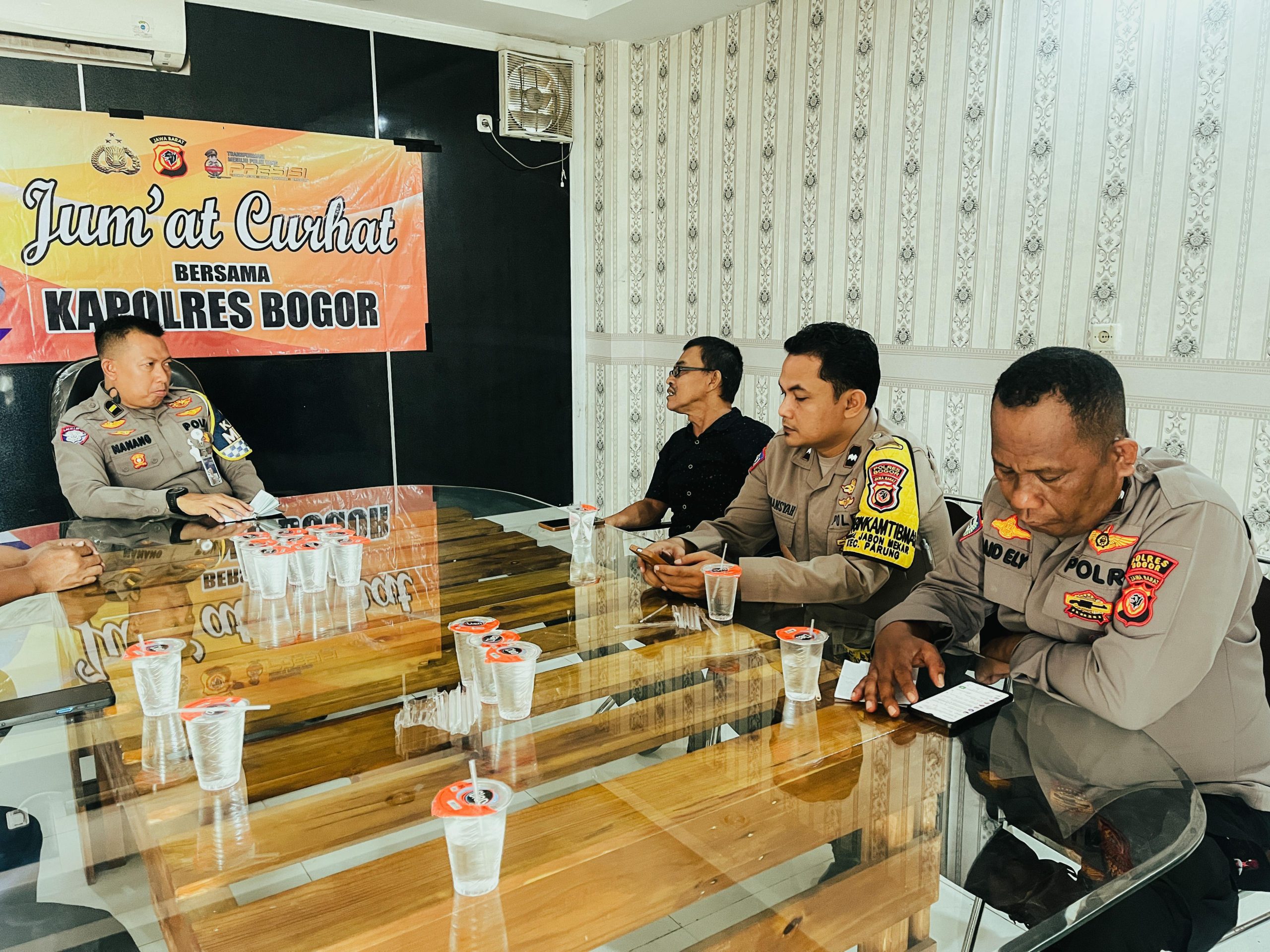 Cibinong – Polres Bogor kembali menggelar program Jumat Curhat sebagai sarana menampung aspirasi, keluhan, dan saran masyarakat terkait situasi keamanan dan ketertiban. Kegiatan yang dilaksanakan pada Jumat (8/8/2025) pukul 09.00 WIB di Ruang Mediasi Polres Bogor ini dipimpin oleh Kaurmintu Sat Lantas Polres Bogor, IPDA Nanang Sirojudin, S.H., dan dihadiri oleh perwakilan satuan fungsi serta Bhabinkamtibmas.