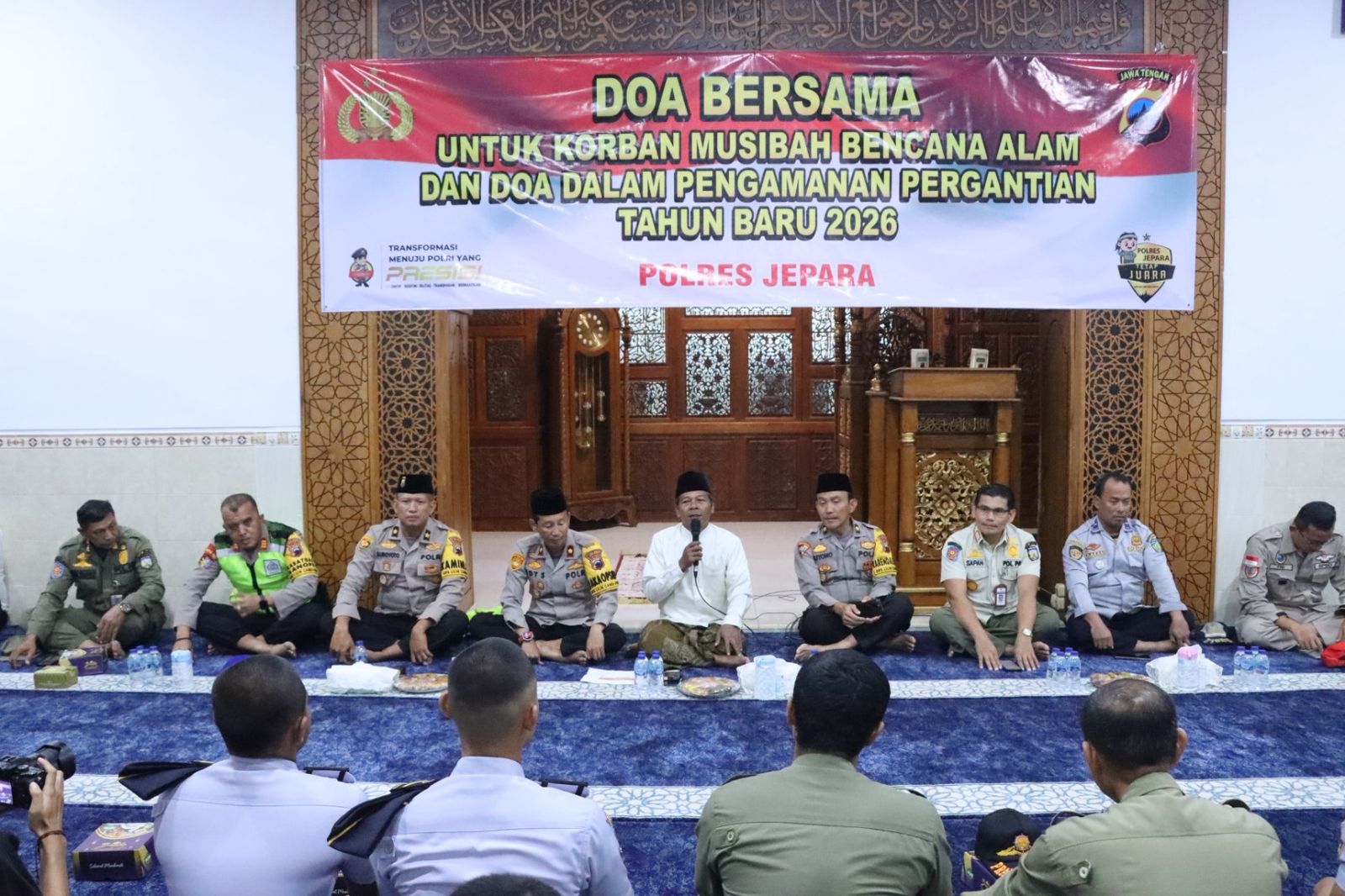 Jepara – Polres Jepara | Kepolisian Resor (Polres) Jepara, Polda Jawa Tengah, menggelar kegiatan doa bersama untuk korban musibah bencana alam dan doa dalam pengamanan pergantian tahun baru 2026 di Masjid Jami’ Kholilurrohman Polres Jepara, Rabu (31/12/2025).